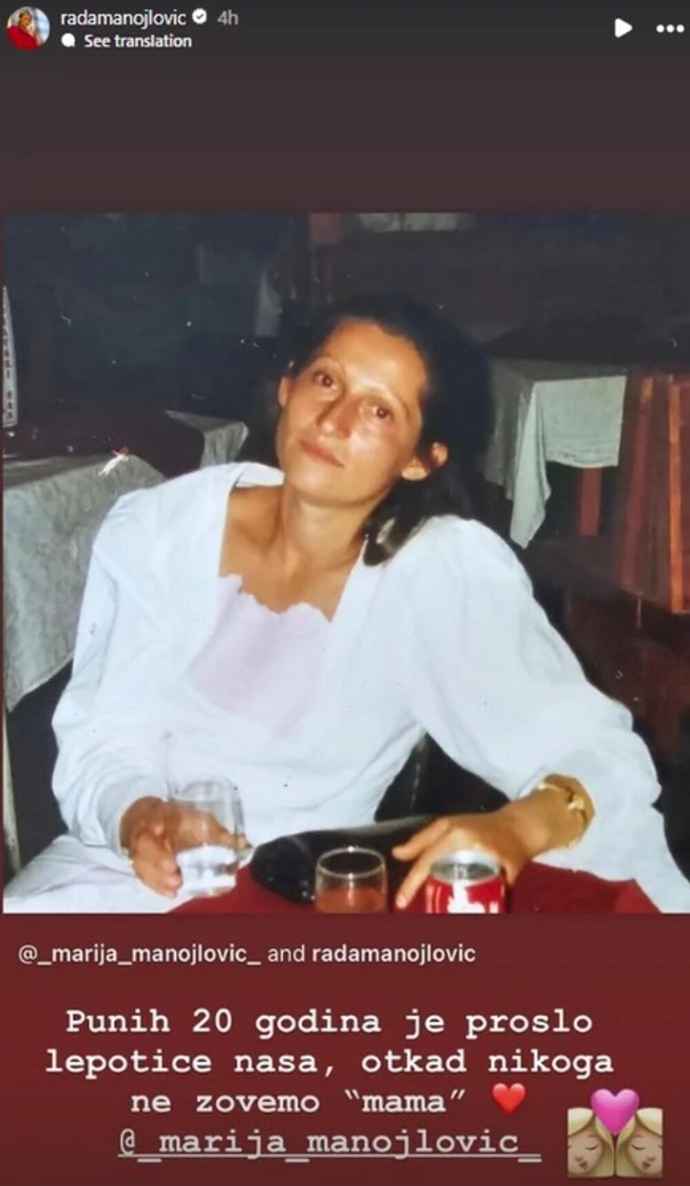 Naime, na današnji dan se navršava 20 godina otkako je Radina majka preminula, a na društvenim mrežama je najpre njena sestra podelila fotografiju njihove majke uz emotivni opis: