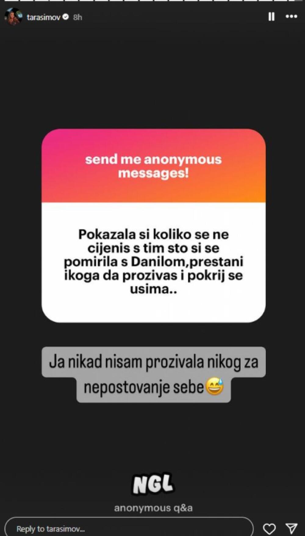 Tara je na društvenoj mreži Instagram odgovara na pitanja pratioca, a sudeću po nekoliko njih, ona se pomirila sa ocem svog deteta, Danilom Raičevićem.