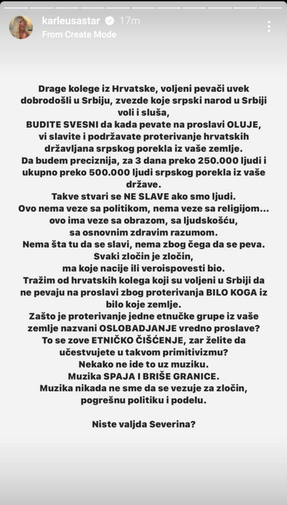 "Drage kolege iz Hrvatske, voljeni pevači uvek dobrodošli u Srbiju, zvezde koje srpski narod u Srbiji voli i sluša, budite svesni da kada pevate na proslavi Oluje, vi slavite i podržavate proterivanje hrvatskih državljana srpskog porekla iz vaše zemlje. Da budem preciznija, za 3 dana preko 250.000 ljudi i ukupno preko 500.000 ljudi srpskog porekla iz vaše države. Takve stvari se NE SLAVE ako smo ljudi. Ovo nema veze s politikom, nema veze sa religijom... ovo ima veze sa obrazom, sa ljudskošću, sa osnovnim zdravim razumom. Nema šta tu da se slavi, nema zbog čega da se peva. Svaki zločin je zločin, ma koje nacije ili veroispovesti bio. Tražim od hrvatskih kolega koji su voljeni u Srbiji da ne pevaju na proslavi zbog proterivanja bilo koga iz bilo koje zemlje. Zašto je proterivanje jedne etnučke grupe iz vaše zemlje nazvani oslobađanje vredno proslave? To se zove ETNIČKO ČIŠĆENJE, zar želite da učestvujete u takvom primitivizmu? Nekako ne ide to uz muziku. Muzika spaja i briše granice. Muzika nikada ne sme da se vezuje za zločin, pogrešnu politiku i podelu", napisala je Jelena Karleuša a potom i dodala: "Niste valjda Severina?"
