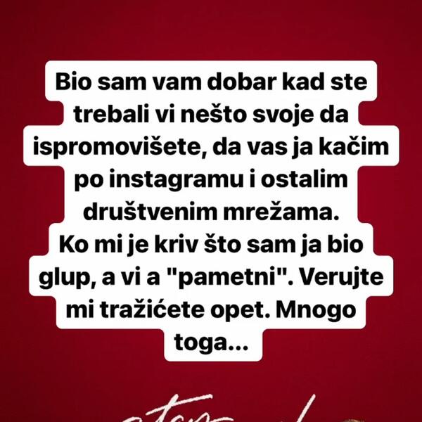 – Bio vam vam dobar kad ste trebali vi nešto svoje da ispromovišete, da vas ja kačim po instagramu i ostalim društvenim mrežama. Ko mi je kriv što sam ja bio glup, a vi "pametni". Verujte mi tražićete opet. Mnogo toga...