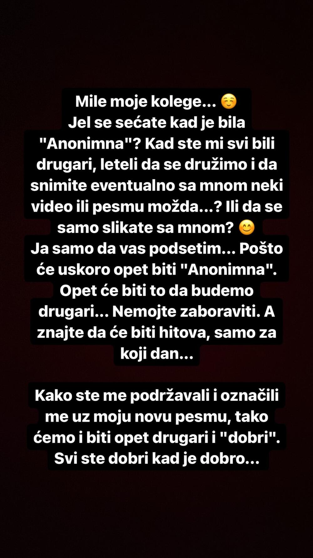 – Mile moje kolege... Jel se sećate kad je bila "Anonimna"? Kad ste mi svi bili drugari, leteli da se družimo i da snimite eventualno sa mnom neki video ili pesmu možda...? Ili da se slikate sa mnom? Ja samo da vas podsetim... Pošto će uskoro opet biti "Anonimna". Opet će biti to da budemo drugari... Nemojte zaboraviti. A znajte da će biti hitova, samo za koji dan... Kako ste me podržavali i označili me uz moju novu pesmu, tako ćemo i biti opet drugari i "dobri". Svi ste dobri kad je dobro... - naveo je Sloba na svom profilu na "Instagramu" i nastavku dodao:
