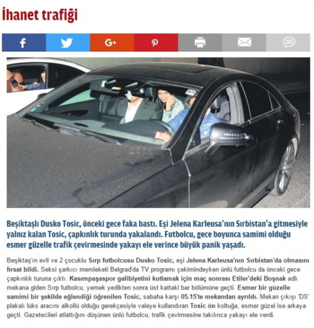 Fudbaler Bešiktaša i srpski reprezentativac Duško Tošić osvanuo je u svim turskim medijima sa anonimnom brinetom u noćnom provodu