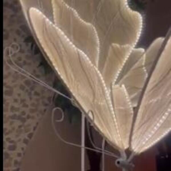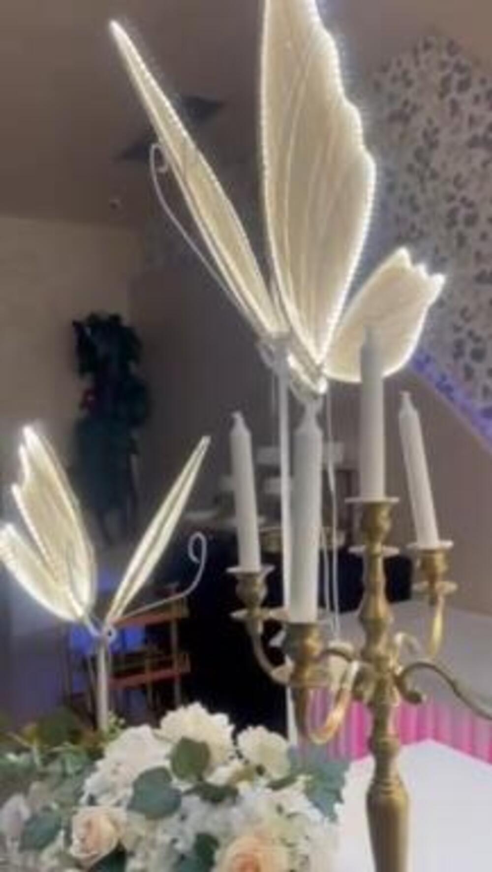 U uglovima su raspoređene velike lampe u obliku leptira, dok su stolovi ukrašeni belim ružama i laticama mirisnog cveća.