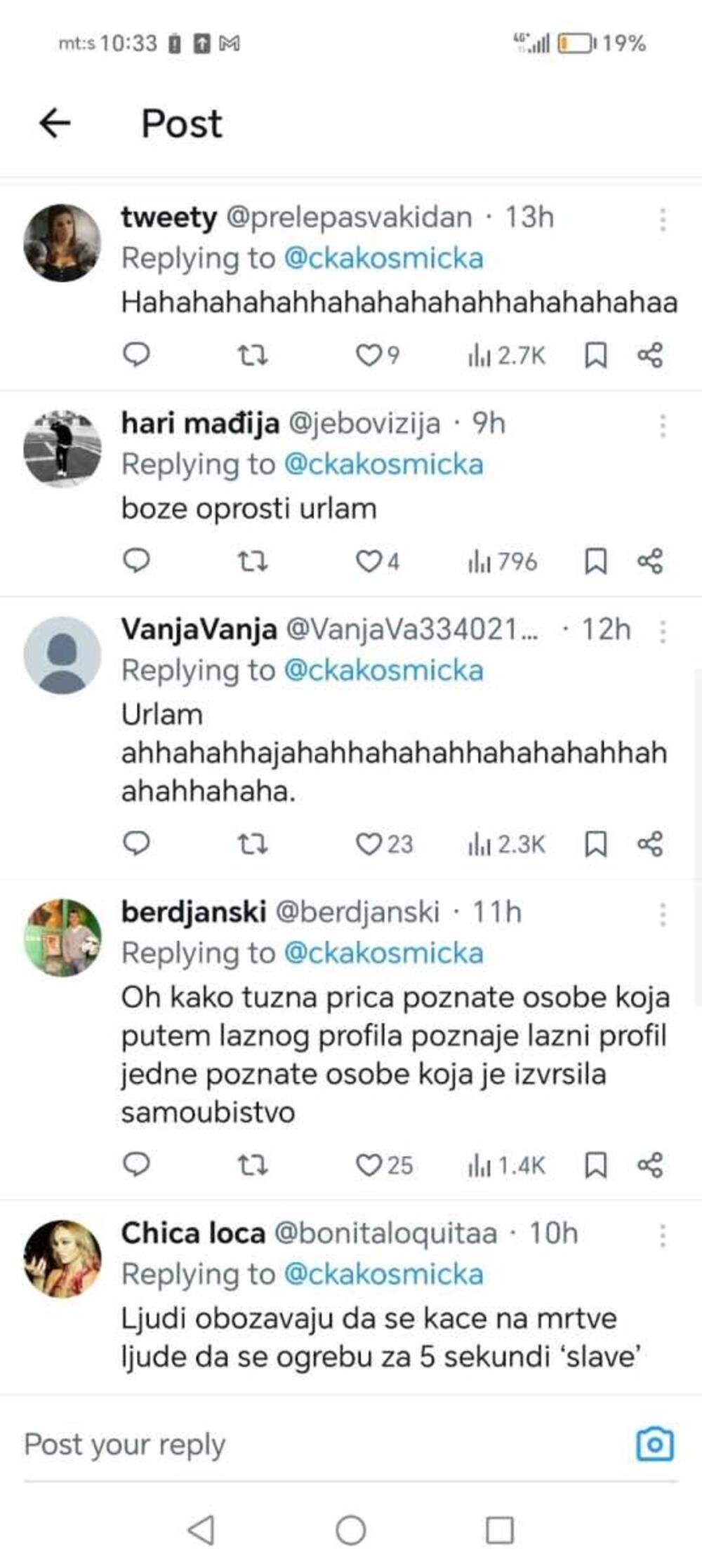 "Bože oprosti, ali urlam od smeha", "Oh, kako tužna priča poznate osobe koja putem lažnog profila poznaje lažni profil jedne poznate osobe koja je završila samoubistvo", "Ljudi obožavaju da se kače na mrtve ljude da se ogrebu za pet sekundi slave", "Da li je realno da je napisala ovako nešto?!", "Jadna, što je starija, to je luđa", neki su od njih.