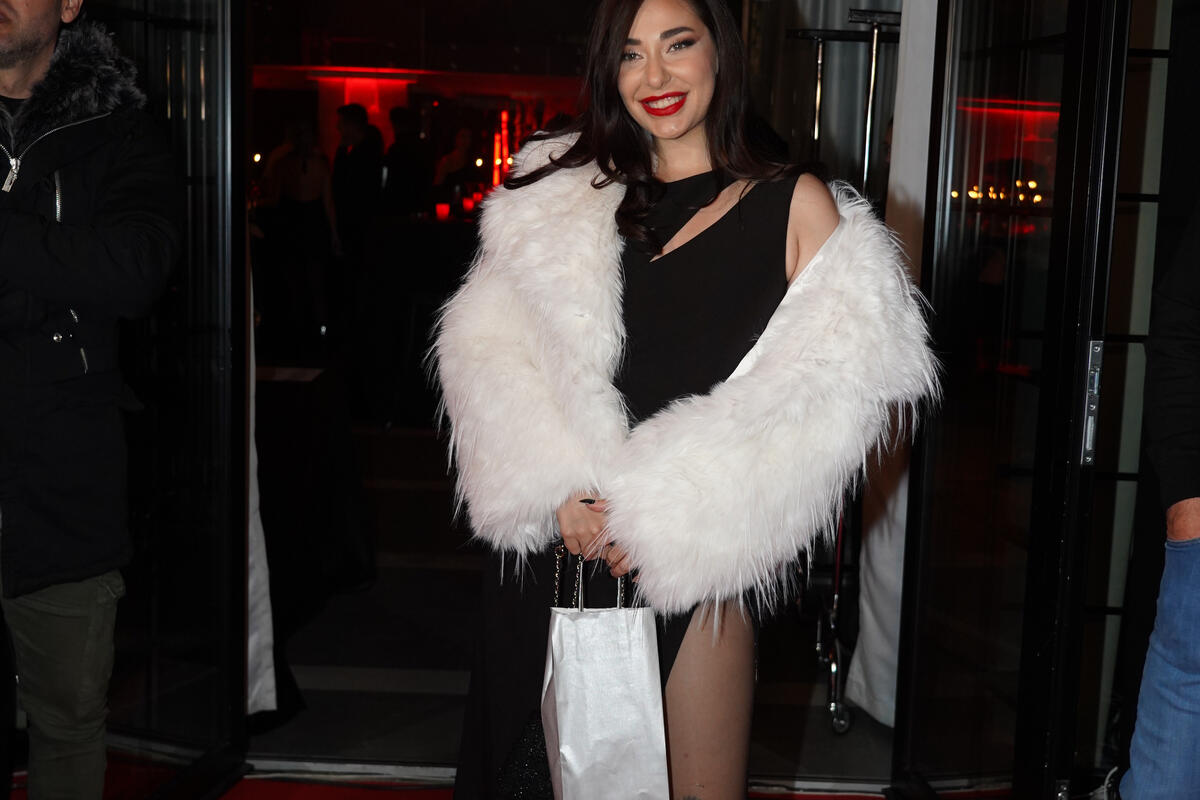 Haljina je imala prorez na ramenima, a stajling je zaokružila belom bundom, crnim hulahopkama i jakim crvenim karminom.