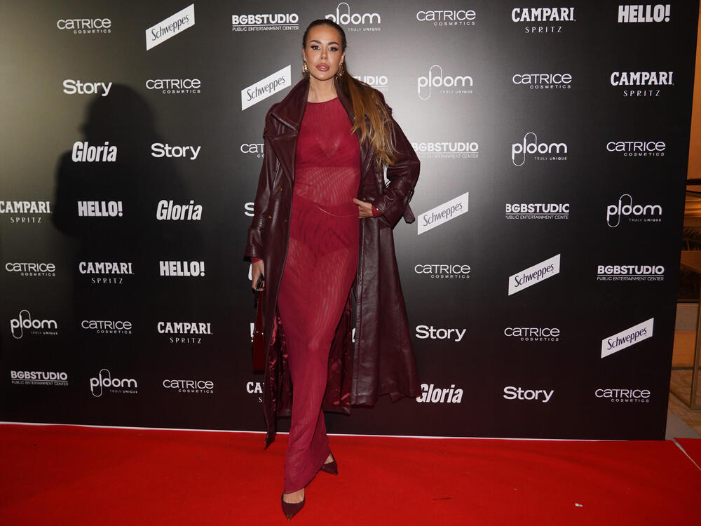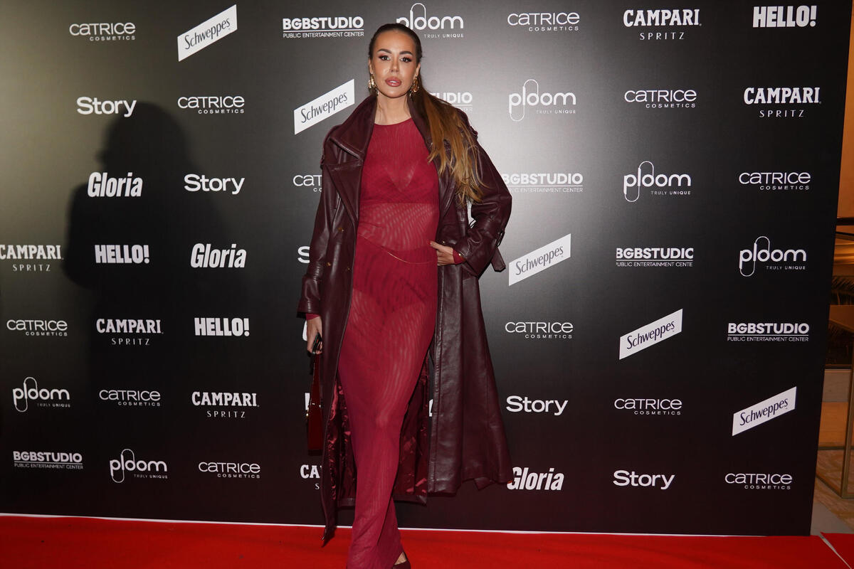 Ona je na sebi imala providnu crvenu haljinu do poda i kožni bordo mantil, a kosu je svezala u rep.