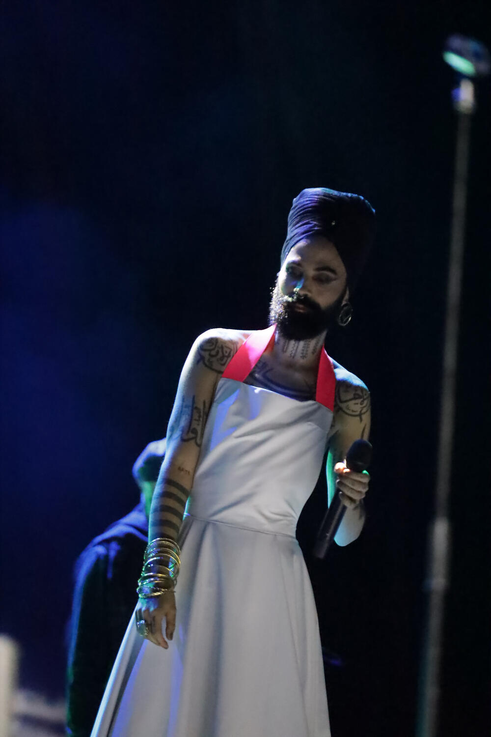 Božo se na sceni pojavio u belog haljini do poda, štiklama i kruni na glavi koja je bila sastavljena od šiblja.