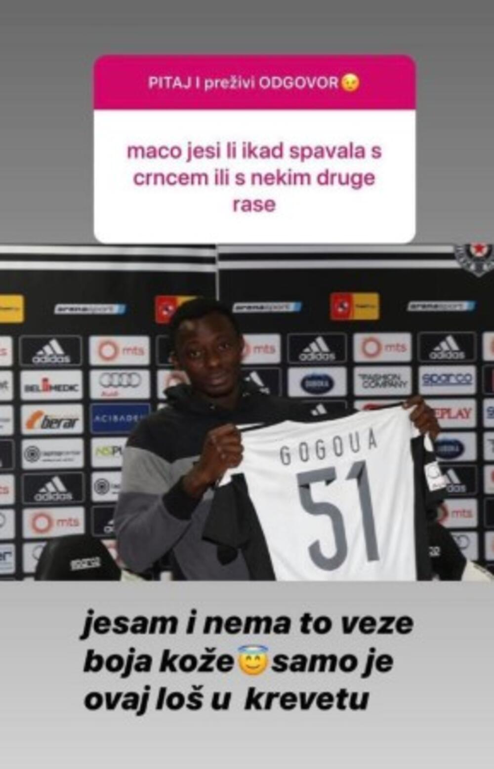 Ona je na pitanje da li je nekada spavala sa čovekom tamnije puti odgovorila da jeste, a reč je o bivšem igraču Partizana Sedrikom Gogui, koji je bio član crno-belih godinu dana, a izuzev gola u Večitom derbiju nije ostavio dublji trag na terenu.