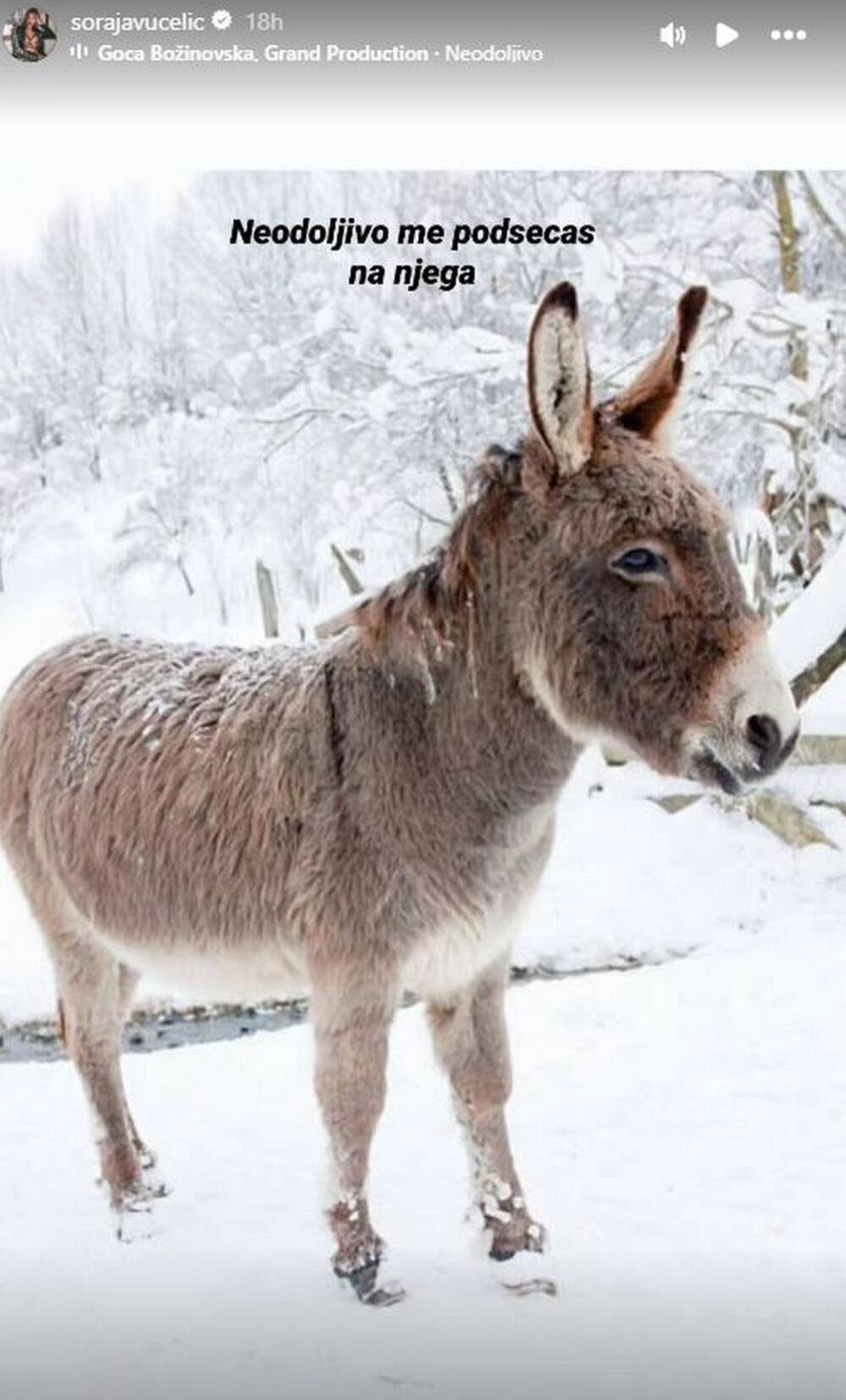 Ako je suditi njenom poslednjem storiju, jedan od njenih bivših partnera se poneo kao "magarac", figurativno rečeno. Ipak, nije otkrila o kome je reč. Sve što je podelila sa svojim pratiocima bila je fotografija magarca na snegu a sliku prate stihovi Goce Božinovske "neodljivo me podsećaš na njega" čime ona očigledno aludira na nekoga od svojih bivših.