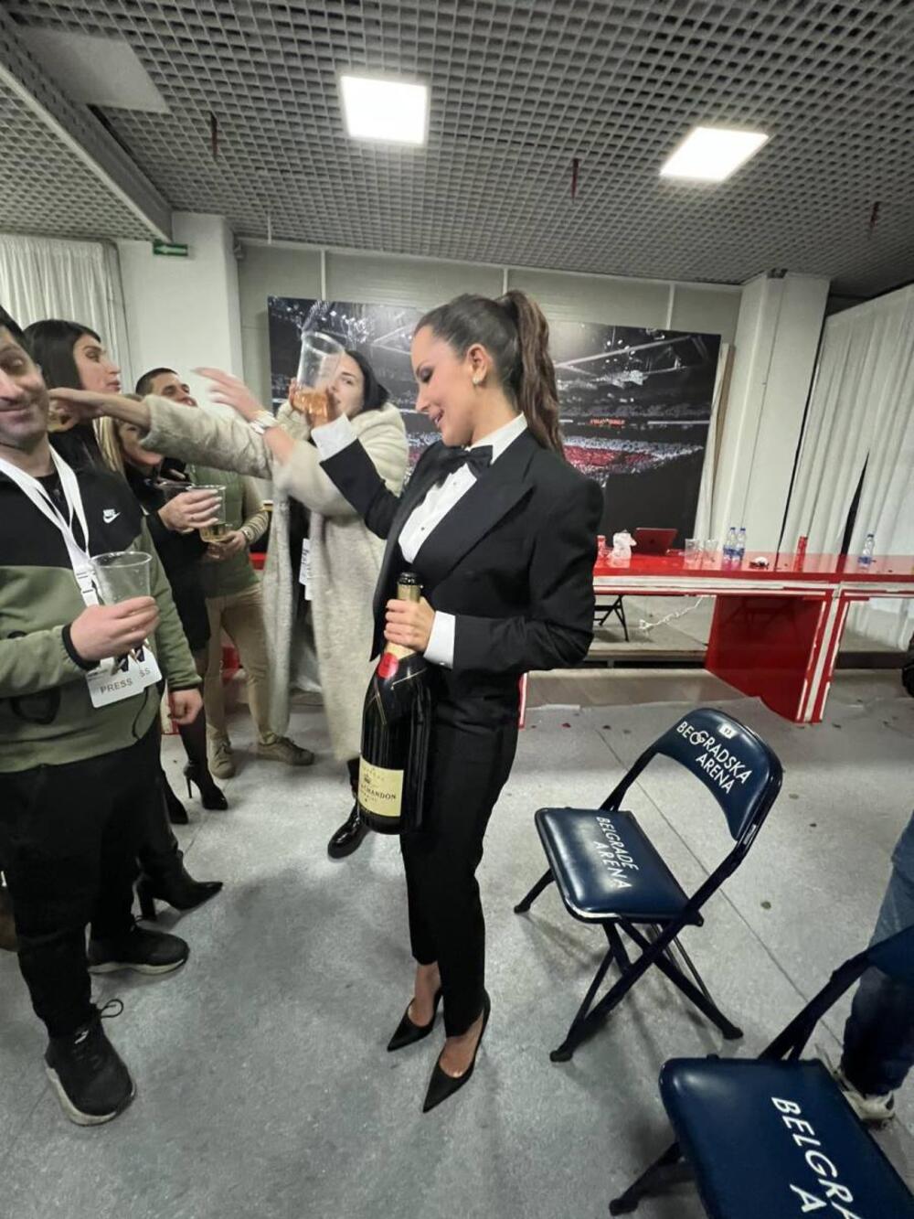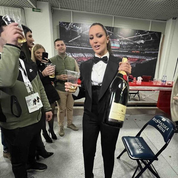Aleksandra je sa prisutnim medijima i nazdravila za kraj turneje šampanjcem “moet” i to flašom od 6 litara, koja stoji oko 100.000 dinara.