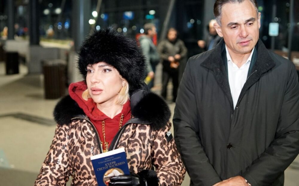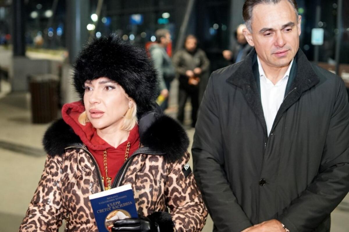 Za putovanje, Jovana je odabrala upečatljivu kombinaciju - dugu jaknu s tigrovim printom, bordo trenerku i crne čizme. Dragan je bio u sportskoj eleganciji, noseći belu košulju, crne pantalone i crnu jaknu.