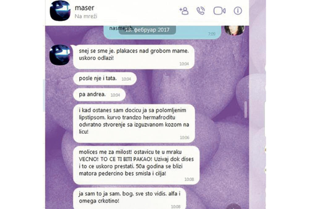 - Odvratno stvorenje sa izgužvanom kožom na licu. Molićeš me za milost. Ostaviću te večno u mraku. To će ti biti pakao. Uživaj dok dišeš, i to će uskoro prestati. Ja sam to. Ja sam bog. Sve to što vidiš. Alfa i omega, crkotino. Pi*ko papučarska prodana, izdao si srpski narod i pobegao u drugu državu sa sebi sličnim. Samo probaj da se vratiš - napisao je u poruci Skendžić.