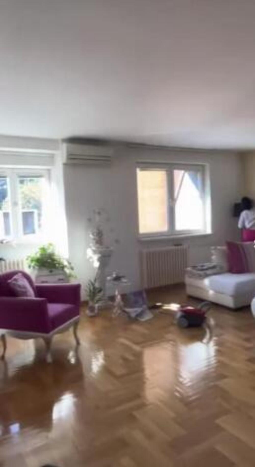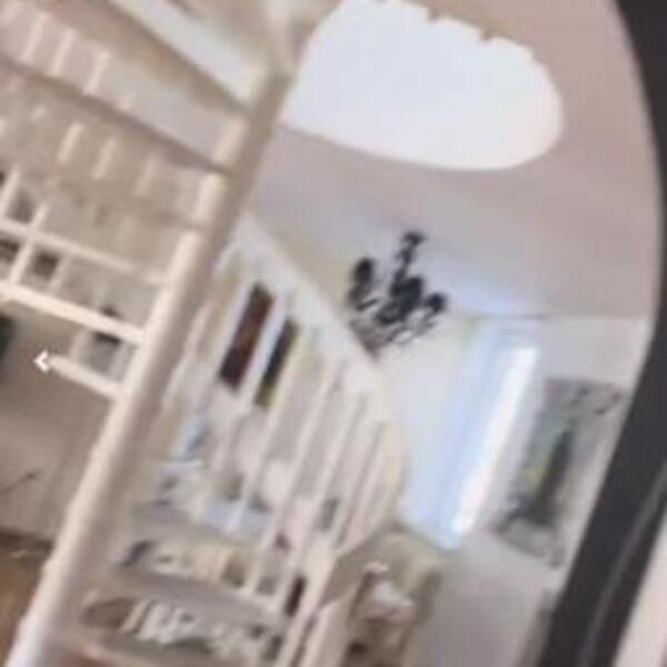 Na snimku se jasno može videti kako Zlata u kućnom izdanju posprema dnevni boravak, koji je veoma prostran, sa ogromnim kaučem i stepenicama nasred istog.