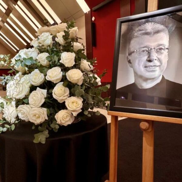 Na bini gde će biti održan govor postavljen je sto, Popovićeva crno-bela slika i veliki buket belih ruža.