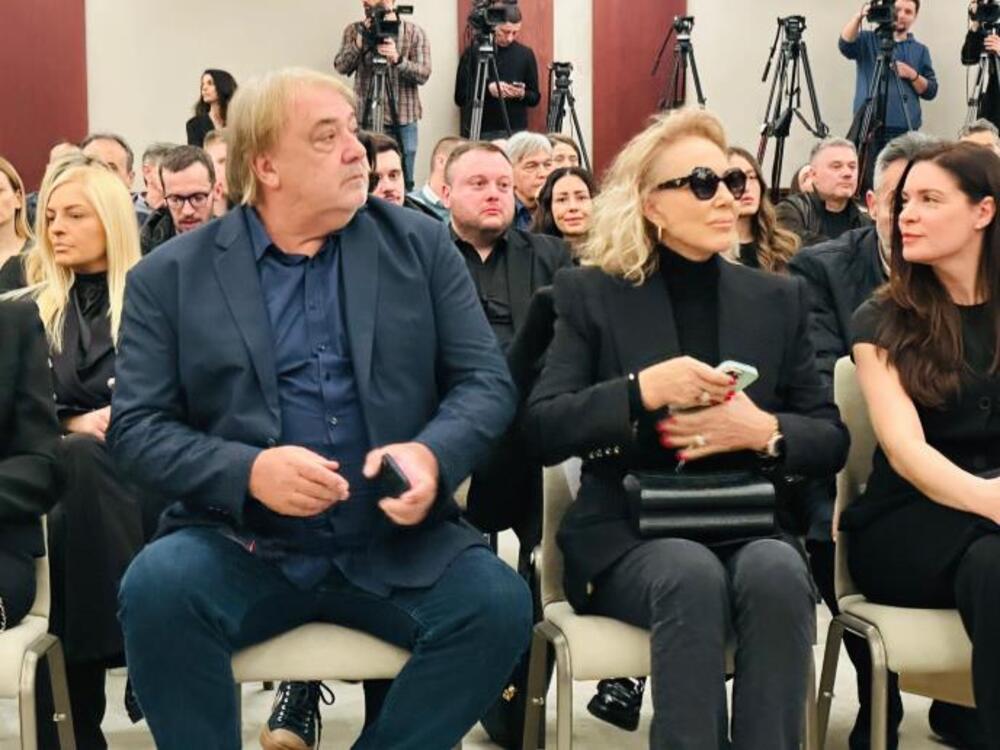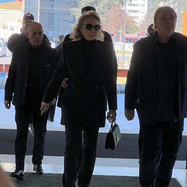 Pevačica zavijena u crno i vidno potrešena stigla je sa suprugom Bobom Živojinovićem i sinom Viktorom. Porodica Živojinović zauzela je svoje mesto u sali gde će zajedno sa porodicom Popović odati poslednju počast estradnom magu.