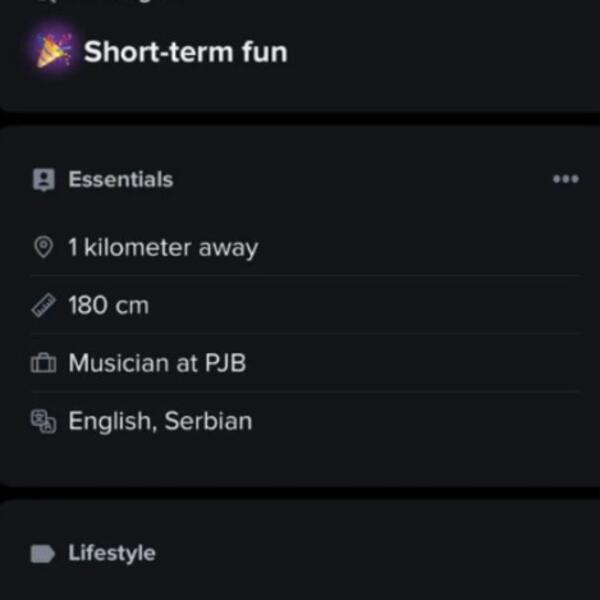 Sebe je opisao kao muzičara od 24 godine. Naveo je da je Strelac u horoskopu, da trenira svakog dana i da ima psa. Ono što je mnoge iznenadilo jeste što je naveo da ovde traži samo kratkoročnu zabavu.