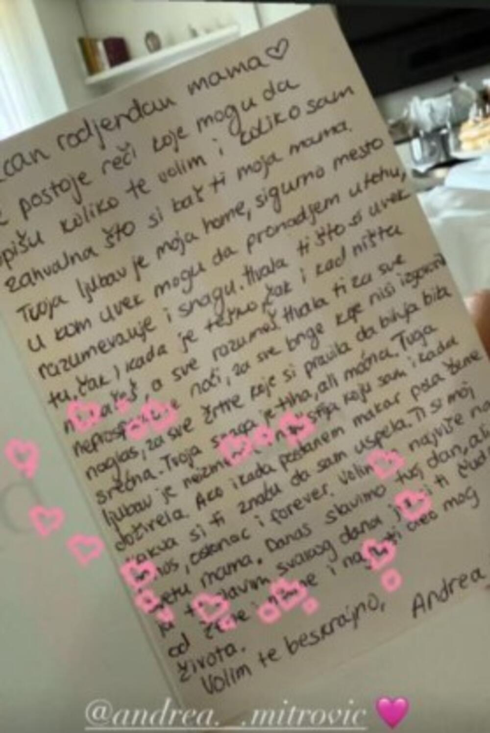 - Srećan rođendan mama. Ne postoje reči koje mogu da opišu koliko te volim i koliko sam zahvalna što si baš ti moja mama. Tvoja ljubav je moja kuća, sigurno mesto u kom uvek mogu da pronađem utehu, razumevanje i snagu. Hvala ti što si uvek tu, čak i kada je teško, čak i kada ništa ne kažeš a sve razumeš. Hvala ti za sve neprospavane noći, za sve brige koje nisi izgovorila naglas, za sve žrtve koje si pravila da bih ja bila srećna. Tvoja snaga je tiha ali moćna. Tvoja ljubav je neizmerna i najčistija koju sam ikada doživela. Ako ikada postanem makar pola žene kakva si ti znaću da sam uspela. TI si moj ponos, oslonac, i forever. Volim te najviše na svetu mama. Danas slavimo tvoj dan, ali ja te slavim svakoga dana jer si ti čudo od žene i mame i najlepši deo mog života. Volim te beskrajno. Andrea - glasila je čestitka.