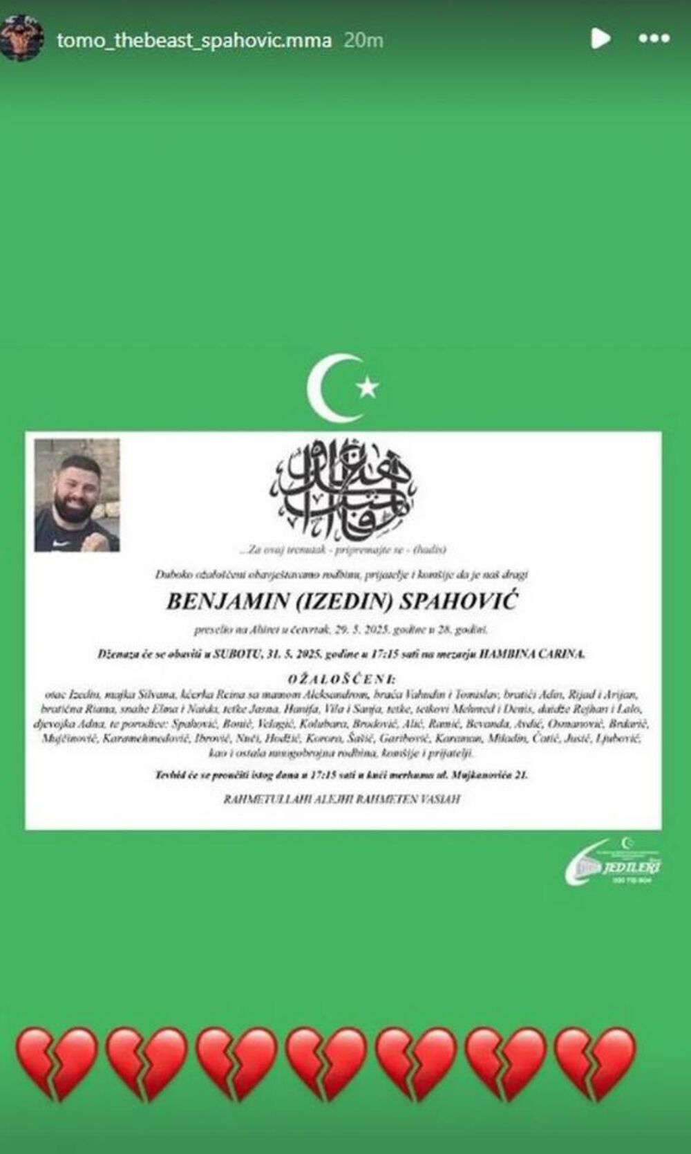 Od njega se opraštaju ožalošćena porodica i prijatelji, a brat Tomislav Spahović obavestio je sve na svom instagramu kada će se obaviti dženaza