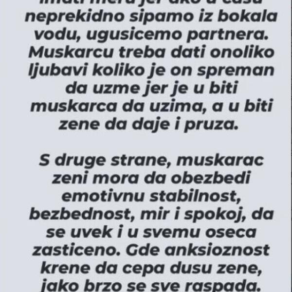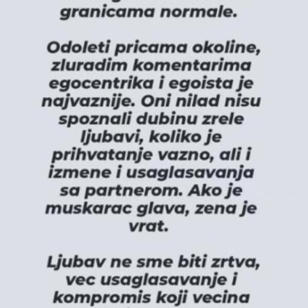 - Ljubav ne sme biti žrtva, već usaglašavanje i komrpomis koji većina egoncetrika smatra kao slabost. Ljubav nije slabost. Ona je najveća sila univerzuma. Bog je ljubav - poručila je ona, između ostalog, a njeni pratioci počeli su da komentarišu da je ona očigledno ovim objavama opisala odnos sa Stankovićem.