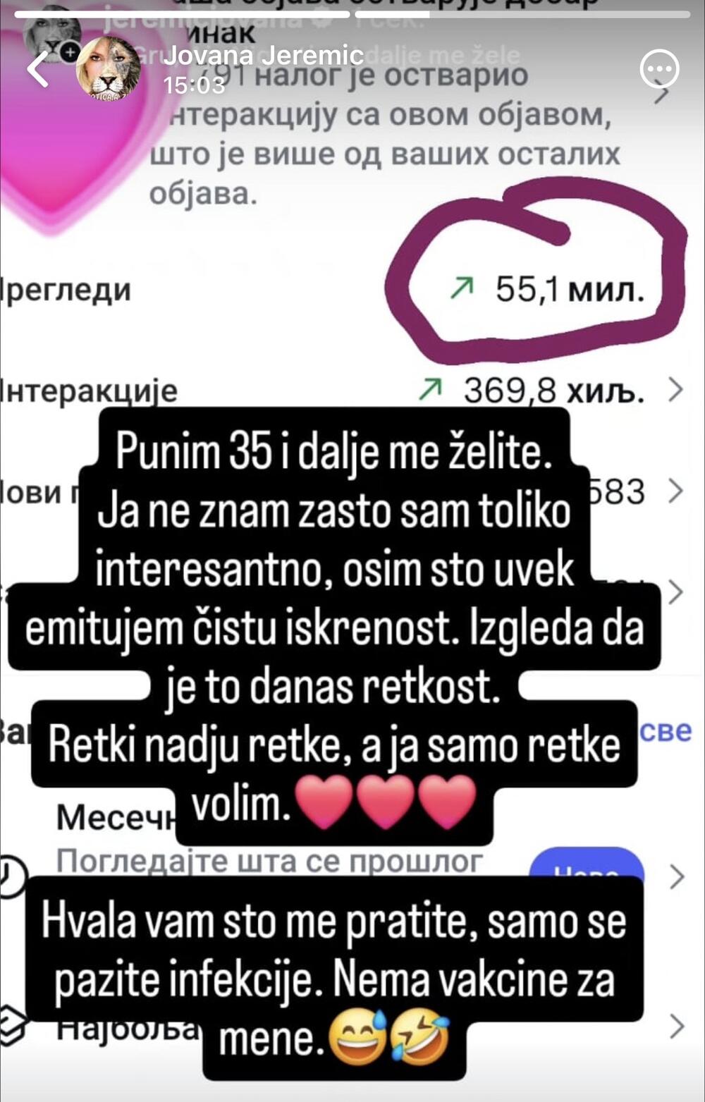 „Punim 35 i dalje me želite. Ja ne znam zašto sam toliko interesantna, osim što uvek emitujem čistu iskrenost. Izgleda da je to danas retkost. Retki nađu retke, a ja samo retke volim“, poručila je Jovana.