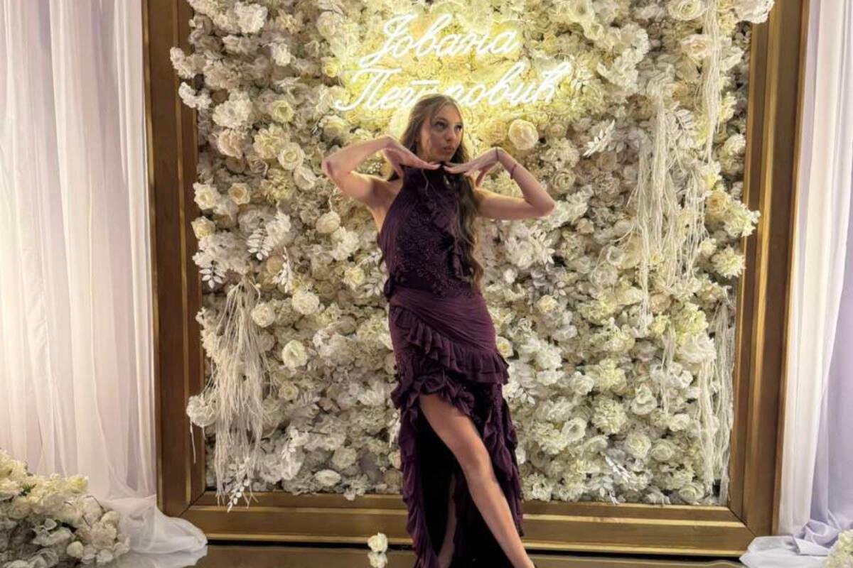 Devojka u prelepoj ljubičastoj dugoj haljini, visoka i tanka, puštene kose pleni svojom lepotom. Ponosna majka Branka u uskoj haljini i sa podignutom kosom nije mogla sakriti sreću koja je isijavala iz nje i ponosni tata Dejan na svoju lepoticu dočekivali su goste uz trubače mladog Milovana Petrovića.