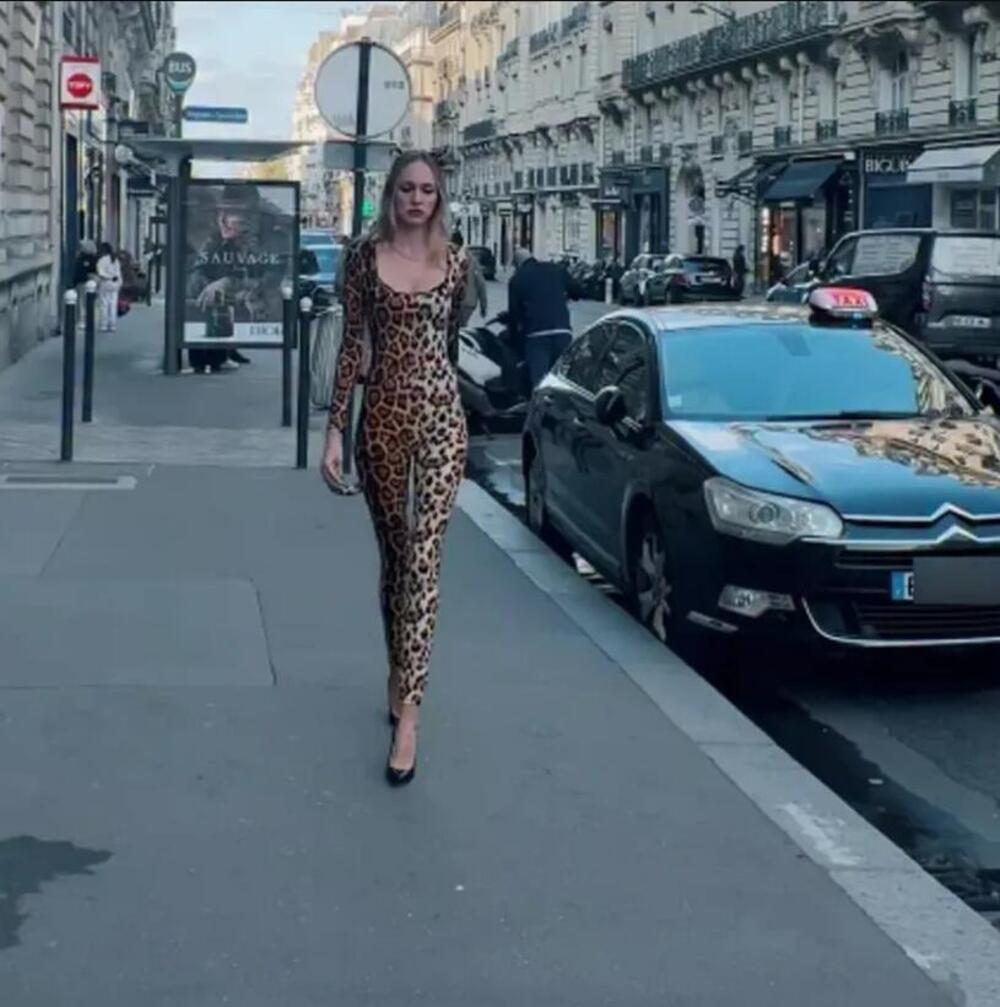 Ona je na sebi imala dvodelni tigrasti tanga bikini, a u jednom trenutku je leđa okrenula kameri pa je zadnjica bila u prvom planu.