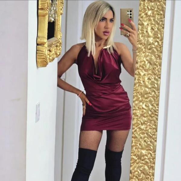 Odabrala je crvenu mini haljinu i mrežaste čarape, dok je na nogama imala čizme preko kolena sa visokom štiklom.