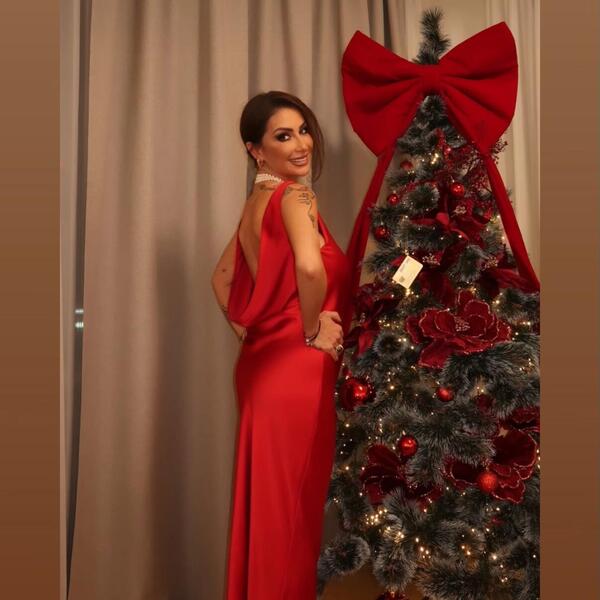 Ceo izgled odiše klasikom, luksuzom i prazničnom elegancijom, savršeno uklopljenom uz ambijent sa bogato ukrašenom jelkom u crvenim tonovima.