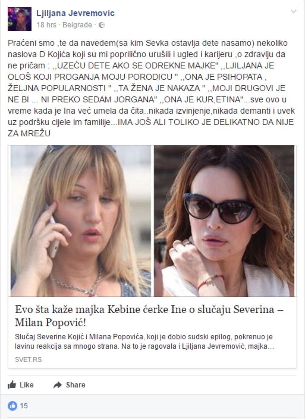 Ipak, priča se nije završila na tome budući da se sada oglasila i Kebina bivša ljubavnica sa kojom ima ćerku Inu. Ona je na Fejsbuku napisala da ne želi da komentariše tuđe licemerje i patetiku, a da je od Kojića dobila samo psihičko maltretiranje.