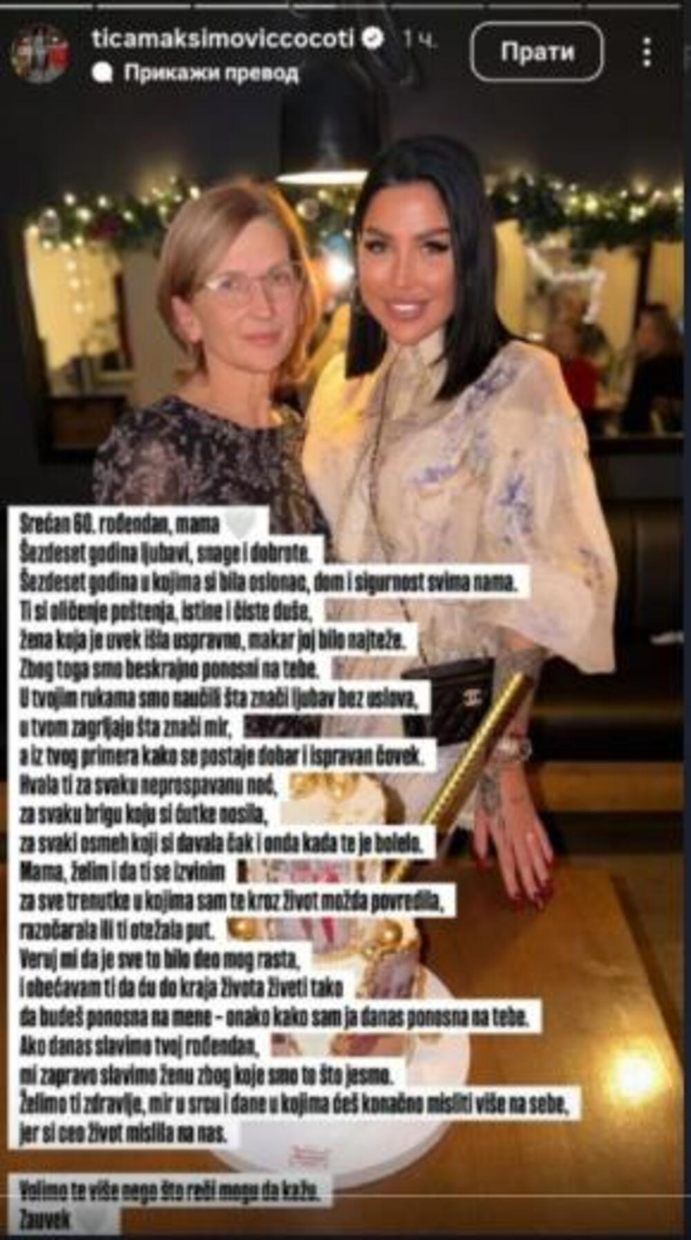 - Srećan 60. rođendan, mama. Šezdeset godina ljubavi, snage i dobrote. Šezdeset godina u kojima si bila oslonac, dom i sigurnost svima nama. Ti si oličenje poštenja, istine i čiste duše, žena koja je uvek išla uspravno, makar joj bilo najteže. Zbog toga smo beskrajno ponosni na tebe. U tvojim rukama smo naučili šta znači ljubav bez uslova, u tvom zagrljaju šta znači mir, a iz tvog primera kako se postaje dobar i ispravan čovek. Hvala ti za svaku neprospavanu noć, za svaku brigu koju si ćutke nosila, za svaki osmeh koji si davala čak i onda kada te je bolelo. Mama, želim i da ti se izvinim za sve trenutke u kojima sam te kroz život možda povredila, razočarala ili ti otežala put. Veruj mi da je sve to bilo deo mog rasta, i obećavam ti da ću do kraja života živeti tako da budeš ponosna na mene - onako kako sam ja danas ponosna na tebe. Ako danas slavimo tvoj rođendan, mi zapravo slavimo ženu zbog koje smo to što jesmo. Želimo ti zdravlje, mir u srcu i dane u kojima ćeš konačno misliti više na sebe, jer si ceo život mislila na nas. Volimo te više nego što reči mogu da kažu. Zauvek - napisala je ona.