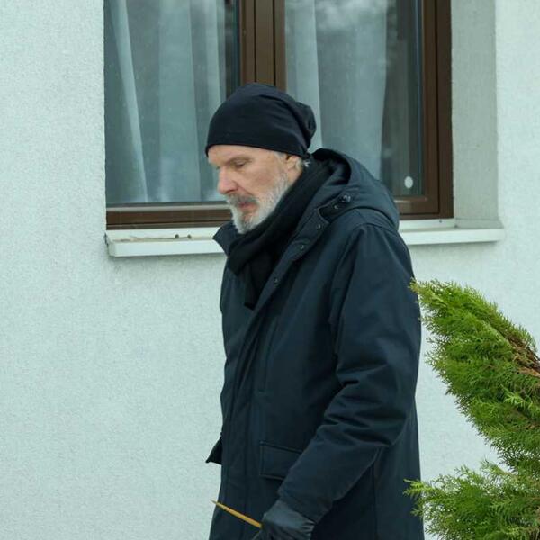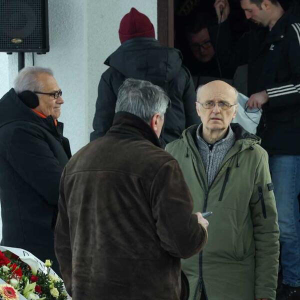 Glumac Slobodan Boda Ninković, koji je inače rođeni brat preminulog Ljube Ninkovića, s članovima porodice prima saučešće ispred kapele.