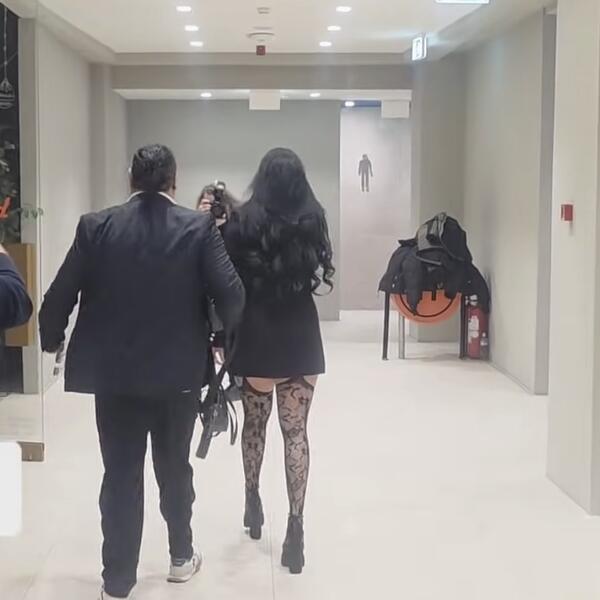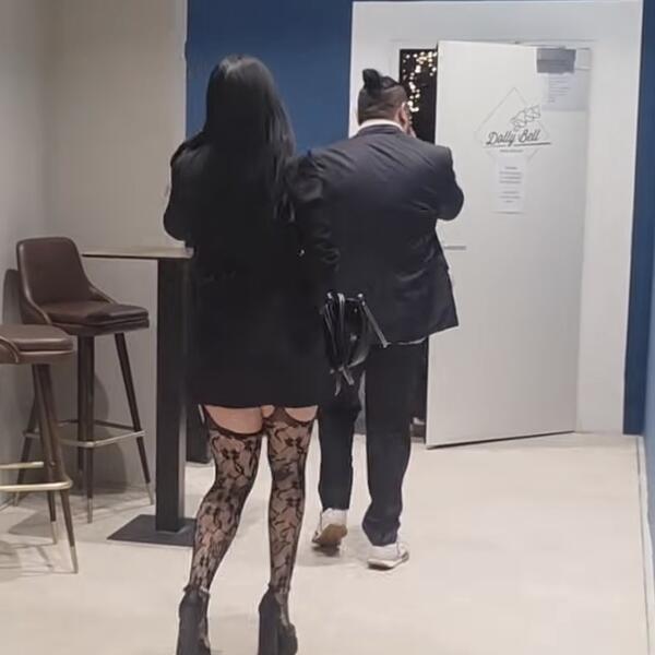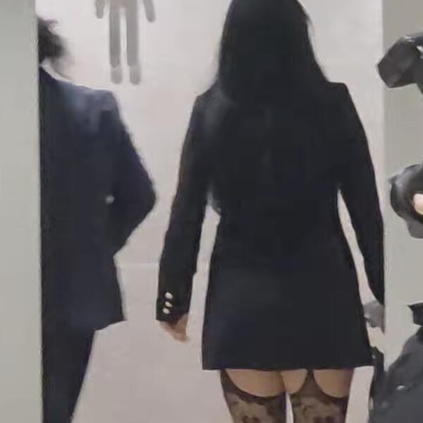 Ultra kratka sako-haljina jedva je prekrivala ono što treba, dok su halter čarape jasno virile, bez imalo namere da ostanu neprimećene. Dama nije bila raspoložena za slikanje i snimanje, te je svoje lice prekrila telefonom.