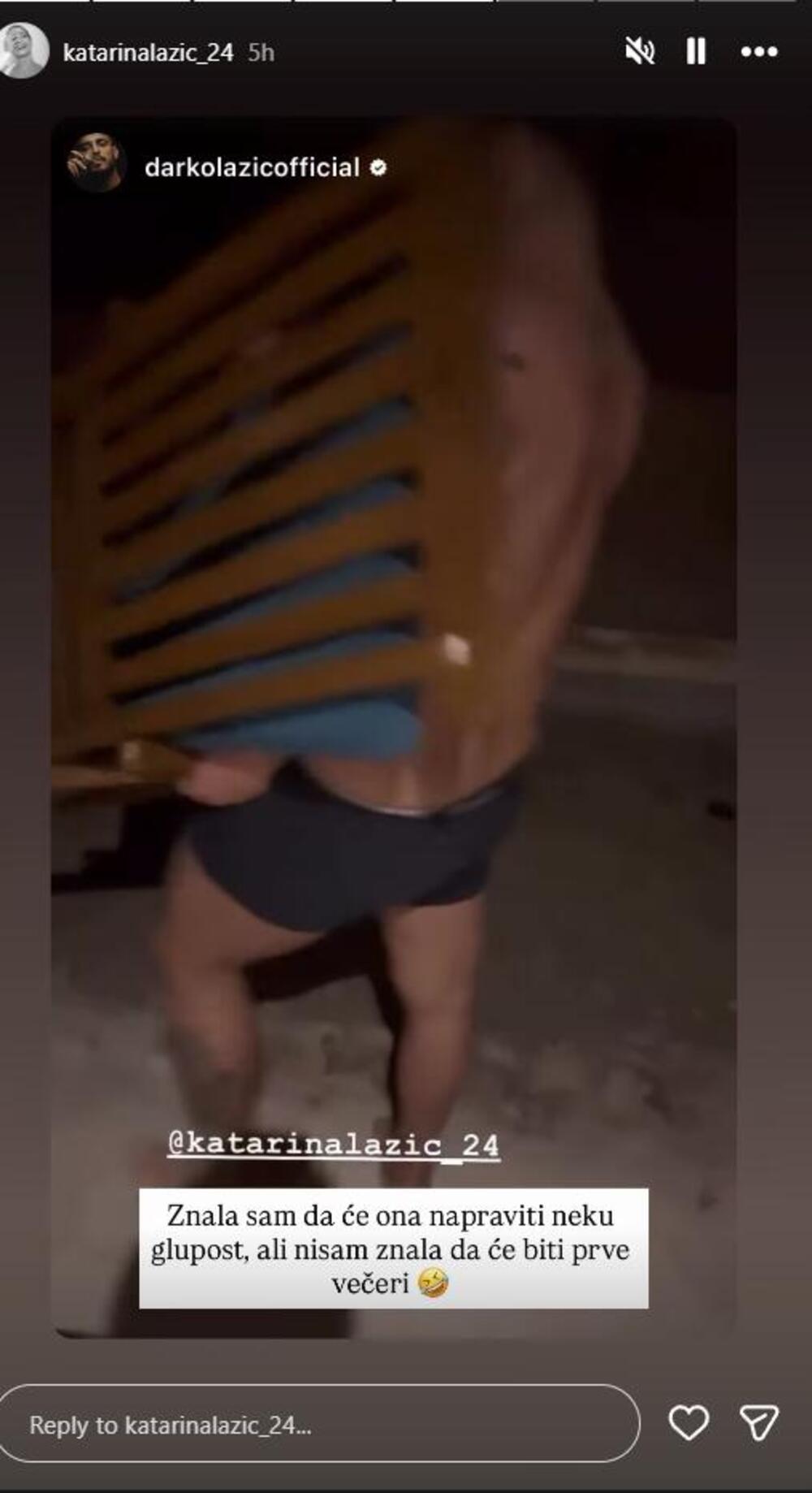 - Ajde, prva noć na Maldivima. U pola noći, Srna nam je zatvorila vrata i nemamo ključ... U, visoko je mnogo, ja mislim da je bolje ja da se popnem - rekla je Katarina kada je shvatila da je previsoko da bi Darko preskočio.