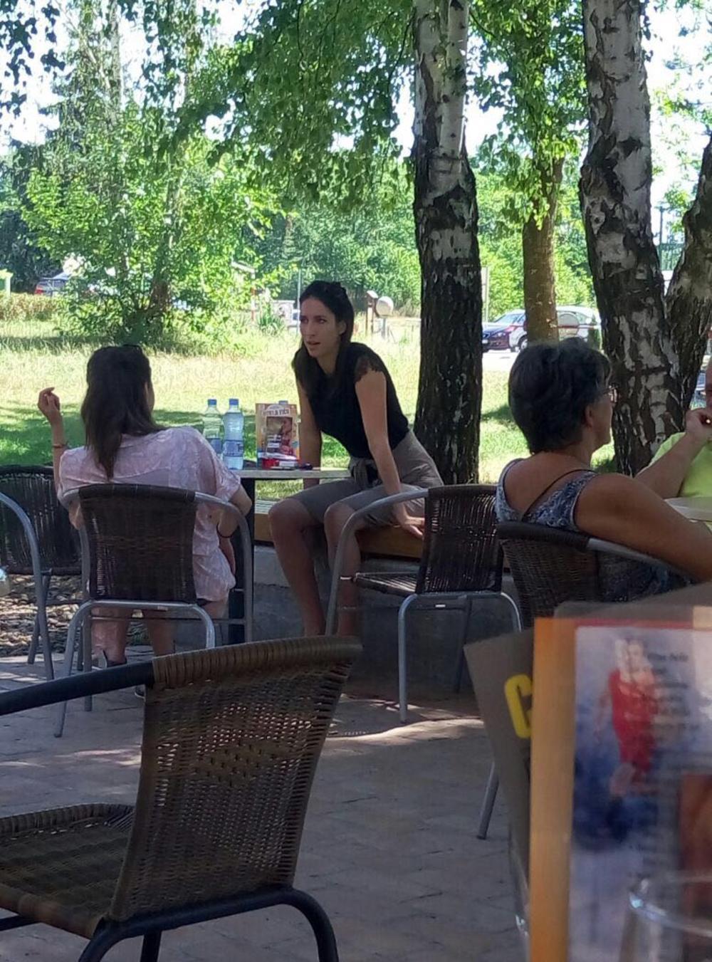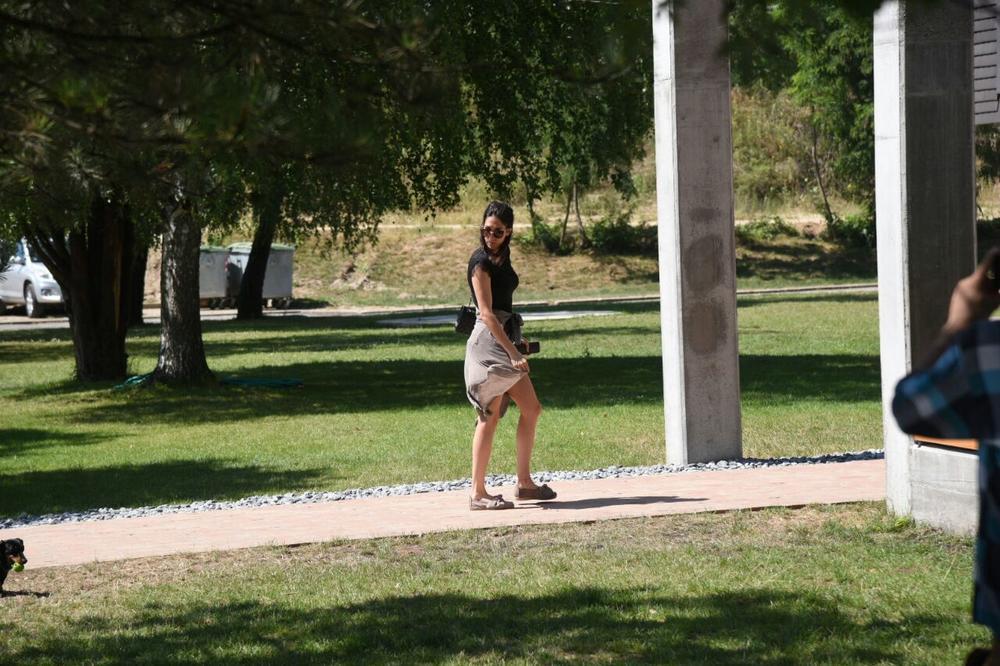Opuštena, u šortsu i majici ćaskala je sa prijateljicom, dok se Teo znojio na terenu.