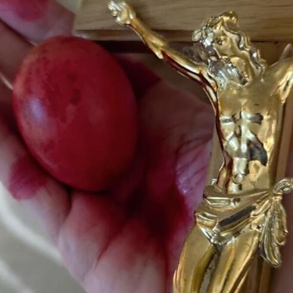 U prvom kadru dominira ikona Bogorodice, ispred koje gori sveća, dok su pored pažljivo aranžirana crvena uskršnja jaja – simbol života i vaskrsenja. Sve odiše mirom i porodičnom toplinom.