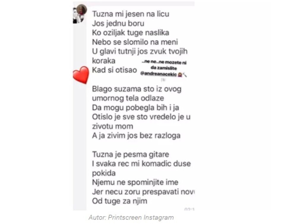 Ana je sa svojim pratiocima podelila stihove pesme koje joj je poslala koleginica Andreana Čekić, a koja se njoj veoma dopala, pa je moguće i da se u ovim stihovima čak i prepoznala.