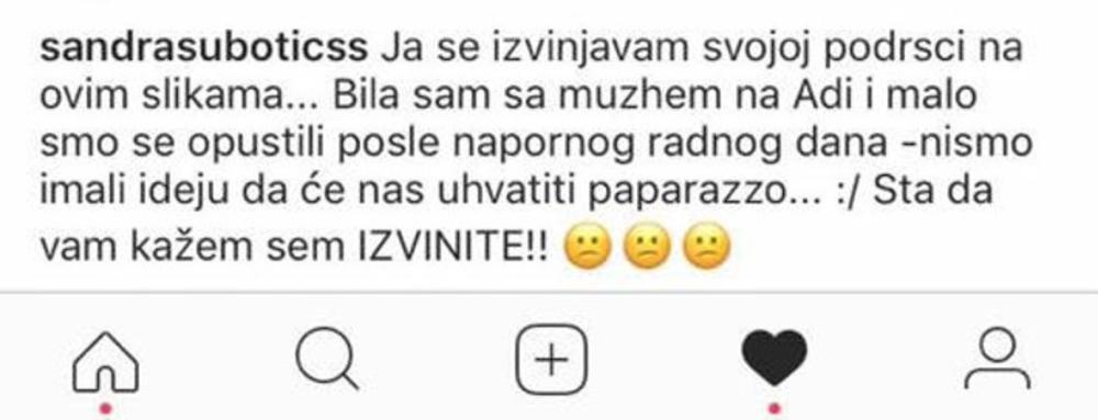 "Ja se izvinjavam svojoj podršci zbog ovih slika... Bila sam sa mužem na Adi i malo smo se opustili posle napornog radnog dana. Nismo imali ideju da će nas uhvatiti paparaci! Šta da vam kažem sem izvinite", napisala je Aleksandra na svom profilu na Instagramu.