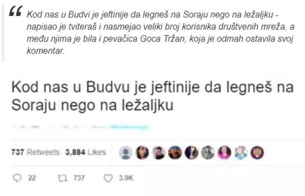 Njoj se već danima ceo region smeje zbog statusa jednog tviteraša koji je, na za mnoge duhovit način, oslikao cene na crnogorskom primorju udarivši na starletu.