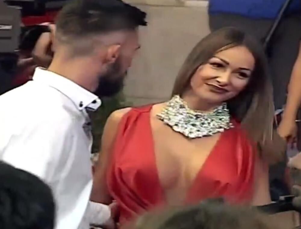 Ona je u veselom duhu prošetala crvenim tepihom i tako iznenadila mnoge prisutne. Za ovu priliku ponela je crvenu haljinu sa dubokim dekolteom, pa su tako grudi bile u prvom planu.