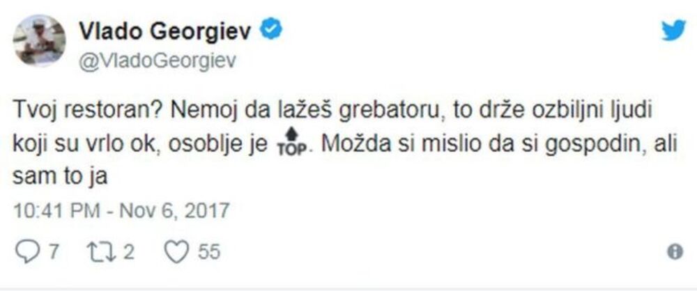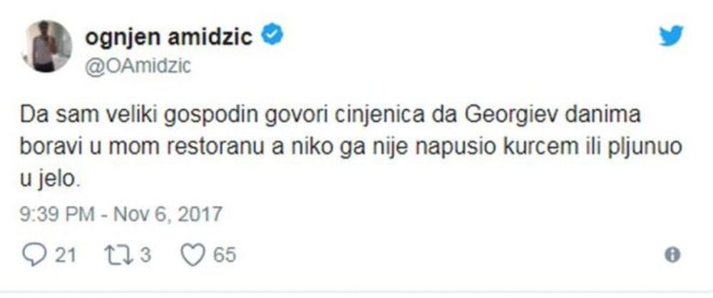 Ognjen Amidžić na Tviteru napisao je kako je veliki gospodin jer Vlado Georgiev sedi u njegovom restoranu, a niko mu nije pljunuo u jelo.