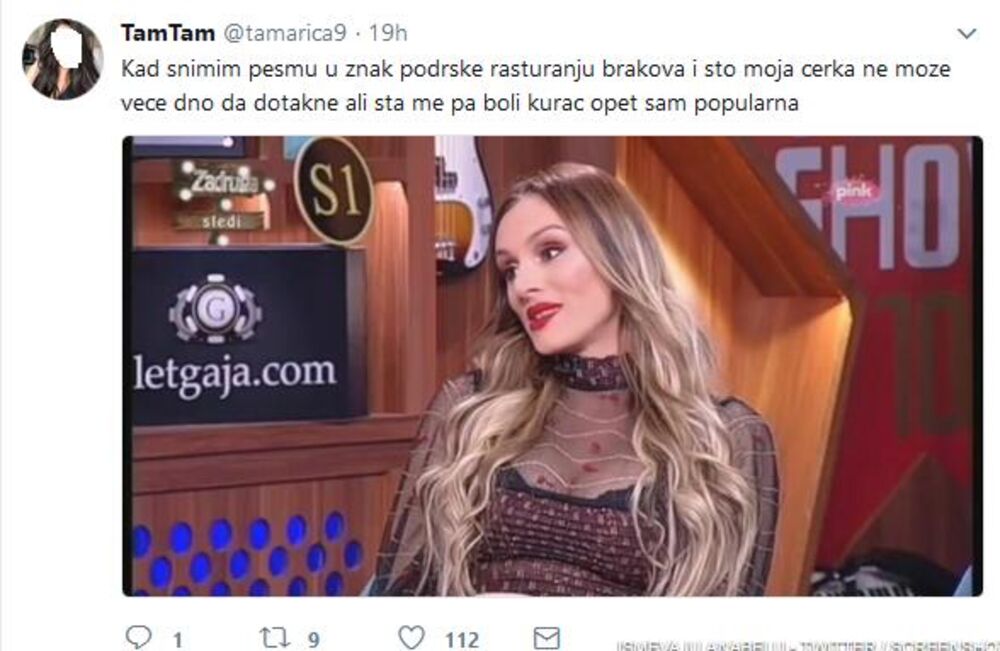 - Kad snimim pesmu u znak podrške rasturanju brakova i što moja ćerka ne može veće dno da dotakne, ali šta me pa boli ku*ac, opet sam popularna - glasi jedan tvit uz koji je okačena i Anabelina fotografija, na kojoj njen izraz lica prikazuje napisano.