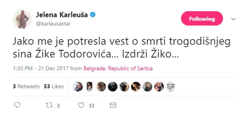 - Jako me je potresla vest o smrti trogodišnjeg sina Žike Todorovića... Izdrži Žiko... - napisala je pevačica.