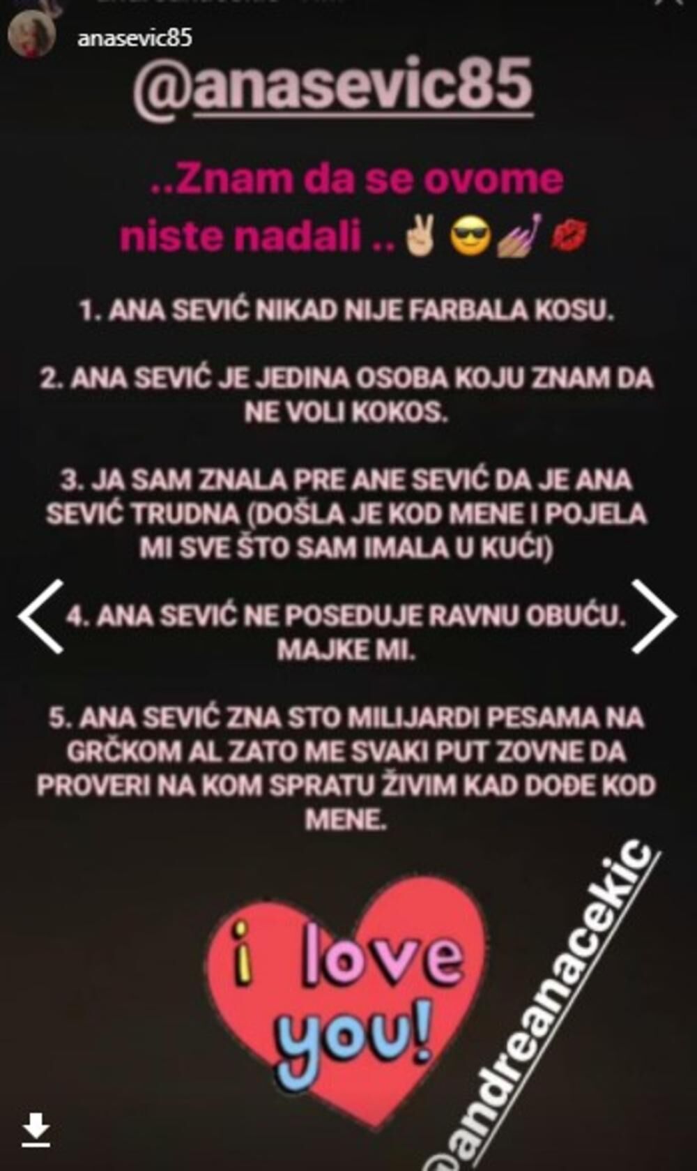 - Dakle, ja ću vam odati 5 tajni Ane Sević, pošto nju mrzi da piše - napisala je Čekićeva.