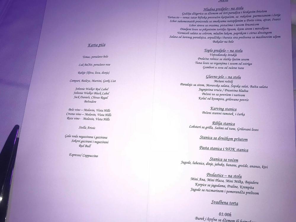 15:40 - Espreso je prvi od svih medija ušao u salu u kojoj će se održati građansko venčanje i žurka za 900 zvanica. Kao što vidite na meniju ima bukvalno svega - počevši od naših tradicionalnih jela pa do sušija.