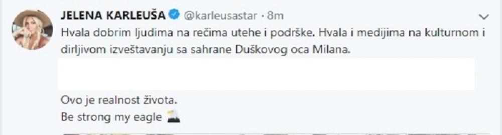 Jelena se nije odvajala od supruga, sve vreme ga je grlila i držala za ruku. Dan nakon sahrane, JK se oglasila na svom Tviteru gde se svima zahvalila na podršci i rečima utehe.