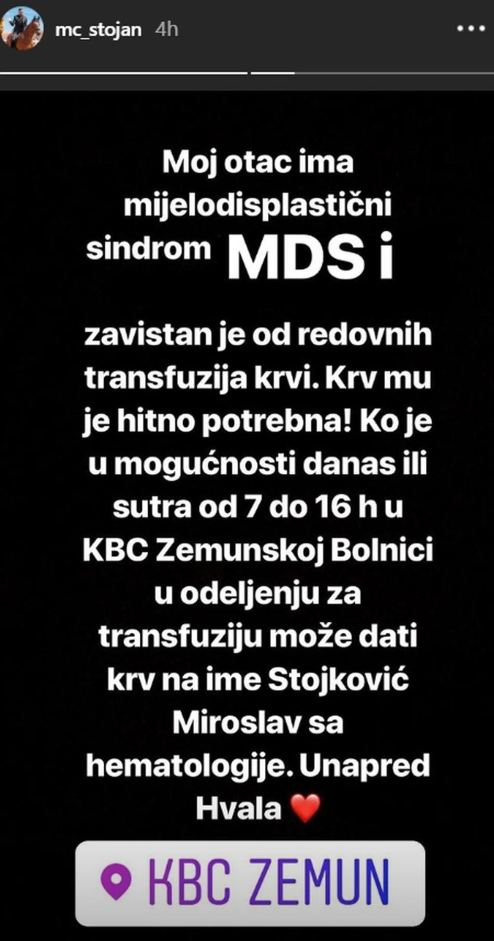 Marko Stojković, poznatiji kao MC Stojan, na Instagramu je zamolio za pomoć sve ljude dobre volje koji mogu da pomognu njegovom ocu koji leži u KBC Zemun.