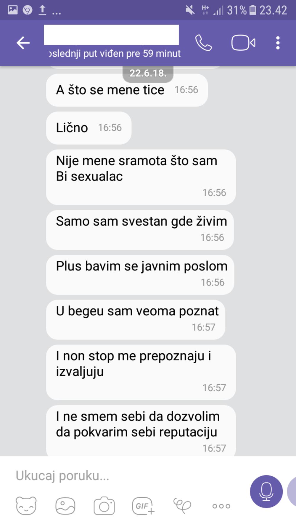 - Iz navedenih poruka zaključujemo da je on već imao takva iskustva. Pošto ja nisam u tom fazonu, nastojao sam da se mi svakako upoznamo, pa ako se nešto desi desilo se. Kada je on shvatio da se ja ne slažem sa njegovim željama, komunikacija je postala slabija zbog toga, a i neki problem je bio daljina. Pošto mi je u nekolicini puta izjavio "ljubav" dolazim do zaključka da od toga nije bilo ni Lj od ljubavi, već da je samo želeo da me iskoristi. Ja sam naravno izrevoltiran jer se neko na taj način poigrao sa mnom i izmanipulisao. Kad god bismo se čuli, on je nalazio neke glupe i bedne izgovore, samo da bi me se što pre otarasio, jer iz strahopoštovanja nije mogao to baš da mi kaže. Jer on vrlo dobro zna moje osobine, takođe zna da kada bi to učinio, da bih ga ja iskompromitovao. Sve te bedne izgovore je na kraju opravdala ta njegova veza sa bivšom učesnicom jednog rijalitija, za koju ja tada nisam znao. Došlo je vreme da istina ispliva na površinu i da seksualna orijentacija kvazi repera bude jasna. Iza svojih reči stojim i stajaću, u slučaju da dotični šuglja tuži mene, ja sve poruke čuvam, ali ne verujem da će doći do toga.