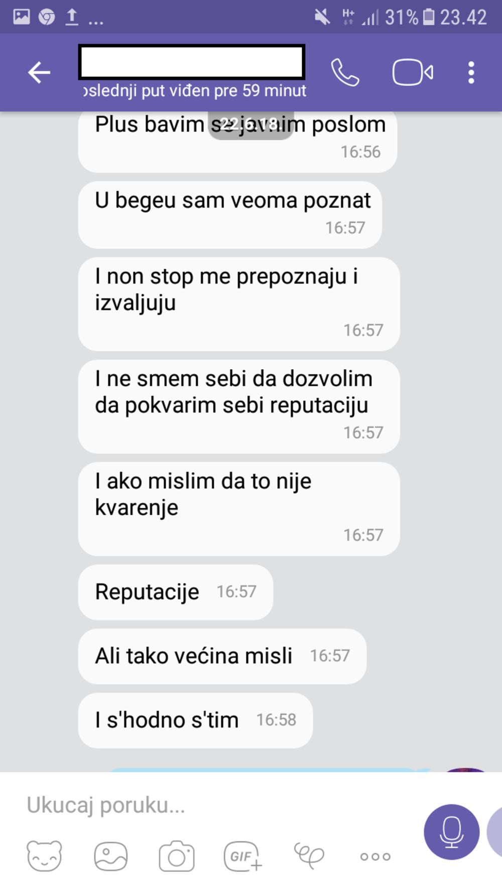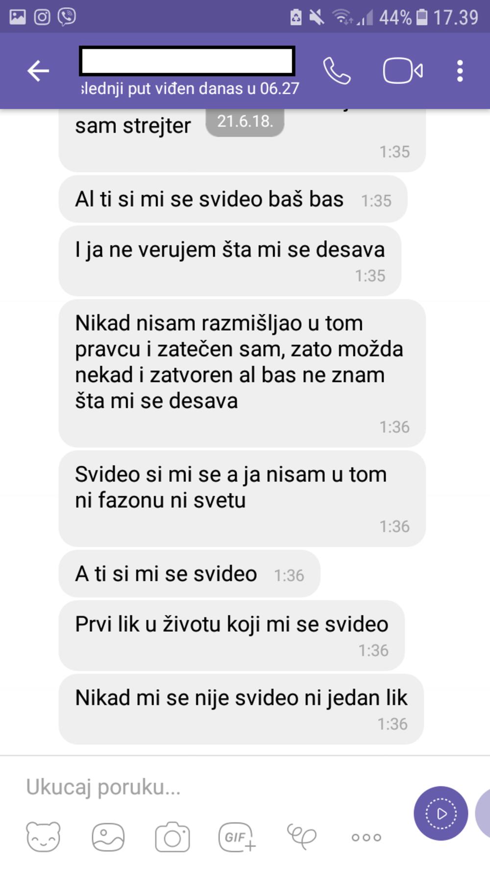 - Sve je počelo ovako...Početkom juna 2018 godine,poslao sam zahtev za prijateljstvo kvazi reperu, nakon par minuta on je prihvatio zahtev i javio mi se porukom "da li se znamo"..Tako smo smo započeli konverzaciju koja je trajala nekih mesec i po dana...Pošto je njemu bilo nelagodno da pišemo na fejsu ,istog dana smo razmenili brojeve telefona,i nastavili smo na viberu,uz dogovor da sve ostane među nama.Sve vreme smo se čuli telefonom. Nakon par dana dopisivanja,počeli smo nešto drugačiju priču, bukvalno priča tu postaje interesantnija.Njega je itekako privuklo i napalilo to što sam trandža, on je izrazio želju da želi da se upoznamo i da stupimo u intimne odnose, tačnije želeo je da ga kre**em i da me oralno zadovolji - započeo je Stefi, ali tu nije bio kraj, nastavio je rečima da je reper prema njegovim saznanjima već imao sličnog iskustva:
