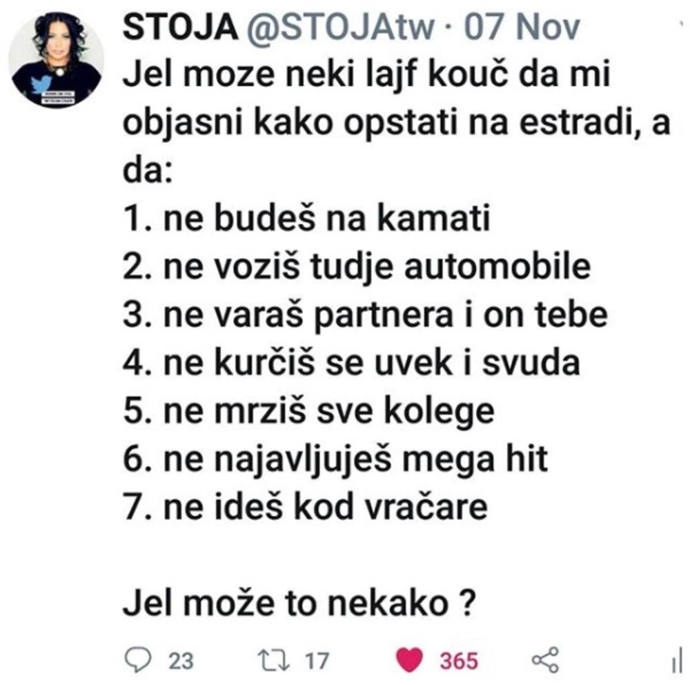 Jel može neki lajf kouč da mi objasni kako opstati na estradu, a da: - ne budeš na kamati - ne voziš tuđe automobile - ne varaš partnera i on tebe - ne kurčiš se uvek i svuda - ne mrziš sve kolege - ne najavljuješ mega hit - ne ideš kod vračare