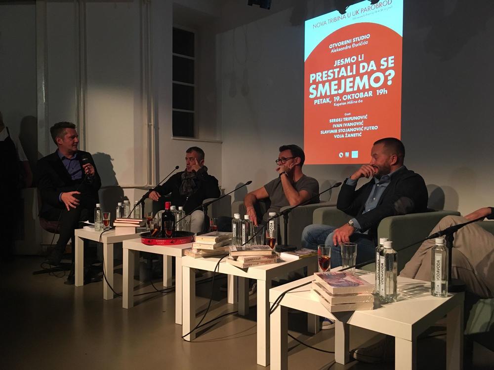 - I ovo je odlično. Ovako neku tribinu bi trebalo imati u Kruševcu, Kragujevcu, Požarevcu, Užicu... Dobro tamo bi nas neko već i prebio. Sergeja bi recimo prebili. Ali on zato nosi kacigu i kad siđe sa motora... iz bezbednosnih razloga. (smeh) Malo se šalimo ali to je realno. Mada trebalo bi da i mi odemo malo van Beograda, da malo pričamo sa ljudima, a da to ne bude politički obojeno - zaključuje Ivan i objašnjava kako crni humor međutim treba izbegavati, ali i da rijalitiji nisu nužno loši po mentalnu svest naroda.